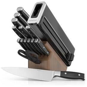 O que está incluído: Faca de chef de 20,32 cm, faca de fatiar 20,32 cm, faca de pão 20,32 cm, faca Santoku 17,78 cm, faca de desossa 12,7 cm, faca utilitária 12,7 cm , faca para descascar 8,89 cm, (x6) facas de carne, tesoura, bloco de facas com afiador embutido.
