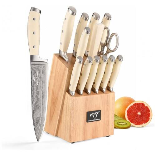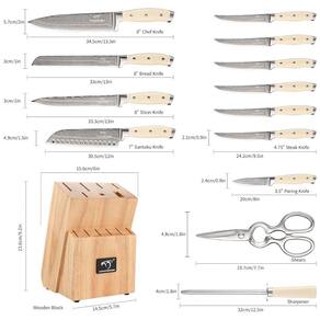 CONJUNTO COMPLETO TUDO EM UM O conjunto profissional de facas de Damasco inclui faca de chef de 20,32 centímetros, faca de corte de 20,32 centímetros, faca de pão de 20,32 centímetros, faca Santoku de 17,78 centímetros, 6 peças de facas de bife de 12,07 centímetros, faca de aparar de 8,89 centímetros, tesoura de cozinha, afiador de faca para ficar afiado e bloco de madeira.