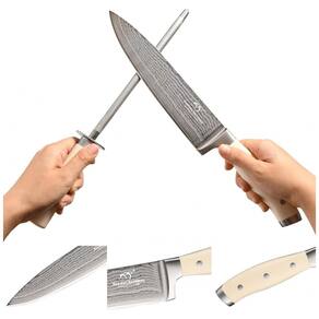 PROJETO DE QUALIDADE As facas são fabricadas com lâminas de aço damasco superiores de 67 camadas com núcleo de aço VG10 para precisão e exatidão. Dureza HRC 60 2 para nitidez excepcional e retenção de bordas. Alça de design curvo proporciona conforto e suporte.