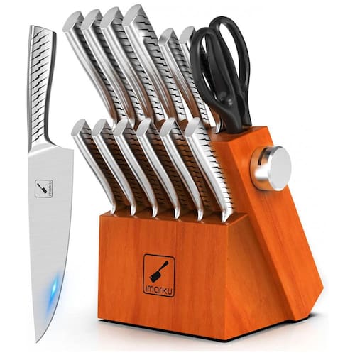 Conjunto de Facas Tudo em Um: O conjunto de facas de 14 peças com bloco inclui: faca de chef de 20,32 centímetros, faca de pão de 20,32 centímetros, faca de corte de 20,32 centímetros, faca santoku de 17,78 centímetros, faca utilitária de 12,7 centímetros, faca de aparar de 8,89 centímetros, conjunto de 6 facas serrilhadas de 11,43 centímetros, tesoura de cozinha e um bloco de facas feito de madeira natural com revestimento fino.