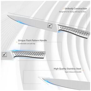 Conjunto de Facas de Design Premium: Este conjunto de facas de cozinha é feito de aço inoxidável de alto carbono, proporcionando nitidez de nível profissional para cortes precisos e facilidade de uso. O design especial de listras relâmpago não é apenas bonito, mas também antiderrapante.