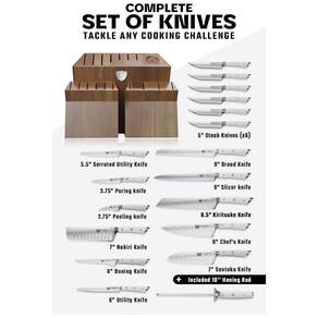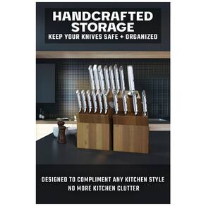 Excelente artesanato, tecnologia de ponta, elementos de design impressionantes e materiais premium. O desempenho máximo nunca pareceu tão bom a esse preço. Incrivelmente afiado, full tang, aço alemão importado de alto carbono com uma borda polida à mão em 16 18 graus por lado. Precisamente temperado e resistente a manchas. Este conjunto vai durar uma vida. Design famoso, com peso satisfatório, materiais premium e sensação de qualidade. As alças de polímero ABS de luxo são rebitadas triplamente com uma aderência que garante conforto e manobrabilidade. Laminado e polido para uma construção sanitária, perfeito para cozinhas ocupadas. Certificado pela National Sanitation Foundation NSF aplica se apenas a facas. Projetado com perfeição com dureza Rockwell 56 e polido à mão para um acabamento acetinado. Cuidadosamente afilado para maior dureza, flexibilidade e resistência mínima ao corte. Conjunto completo em um impressionante bloco de madeira de acácia feito à mão. Certificado pela National Sanitation Foundation NSF aplica se a facas Marca: Não Informado