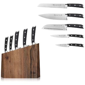 Facas full tang artesanais forjadas em aço sueco Sandvik 14C28N de grão fino para incrível durabilidade, resistência a manchas e excepcional retenção de borda. Design patenteado USPTO. Cada lâmina passa por um tratamento térmico ultra6 de estágio, garantindo que cada lâmina mantenha sua força e função. Um conjunto de facas de qualidade é a base de qualquer cozinha. Seja desossando um frango ou descascando uma maçã, este conjunto de nível profissional contém as facas necessárias para concluir qualquer tarefa de cozinha. Certificado internacional NSF. Garantia vitalícia contra defeitos de fabricação. Lave as facas com água morna e um pouco de detergente, enxágue com cuidado e seque com uma toalha Marca: Não Informado