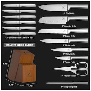 CONJUNTO DE FACAS DE COZINHA EXCLUSIVO conjunto de facas imarku 15 peças com bloco inclui faca chef, faca santoku, faca de pão, faca de fatiar, faca, faca de cozinha, tesoura de cozinha, conjunto de 6 facas para bife, haste de afiar faca e bloco de faca de madeira. Apenas o conjunto de facas de chef certo para satisfazer todas as suas necessidades culinárias CONJUNTO DE FACAS DE EXCELENTE QUALIDADE COM BLOCO Cada lâmina de faca neste conjunto de facas é feita de aço inoxidável alemão de alto carbono premium com excelente resistência à ferrugem, corrosão e descoloração. Qualidade testada por 100 chefs antes de vender este conjunto de facas de cozinha, nenhuma das facas enferrujou ou quebrou dentro de seis meses de uso adequado. CONJUNTO DE FACAS ULTRA SHARP O processamento acetinado profissional fornece nitidez ideal e afia ainda mais a borda da lâmina para obter fatias ultrafinas e corte preciso. É um conjunto de facas de chef profissional e pode atender às necessidades diárias da cozinha, como fatiar, cortar, picar, etc. CUIDADO FÁCIL A ventilação inferior do bloco de facas foi projetada para evitar que o porta lâminas fique úmido e mantenha as lâminas secas. Pode ser lavado na máquina de lavar louça, mas a lavagem à mão pode manter melhor a nitidez e o brilho da faca Marca: Não Informado