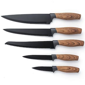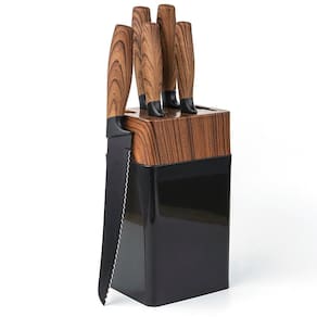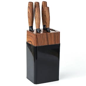 CARACTERÍSTICAS: As facas possuem lâmina em aço inoxidável e cabo com efeito imitando madeira. O cepo que acompanha possuem as mesmas cores das facas para combinar e trazer sofisticação para a decoração da sua cozinha.