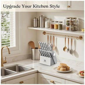 O conjunto de facas de cozinha imarku de 14 peças em aço inoxidável de alto carbono oferece lâminas forjadas com afiador embutido no bloco de madeira sólida para manutenção prática do fio, adequado para cortes em carnes, vegetais, frutas e pães em preparos domésticos diários. O design com cabos em polipropileno antiderrapante promove controle seguro mesmo com mãos úmidas ou gordurosas. Bloco organizador em acabamento cinza-branco otimiza espaço na bancada.