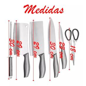 Conjunto de 7 peças: 4 facas de tipos e tamanhos variados, suporte / base Giratorio, Chaira e Tesoura.