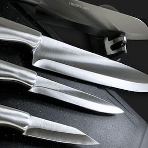 6 faca cutelo8 faca pão8 faca chefe6 faca santoku5 faca utilidade3 faca paringTesouraCepo com afiador