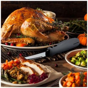 Facilite as ceias de feriado com o Conjunto de Facas Elétricas Sem Fio da Kalorik. Com ele, você pode facilmente esculpir peru, presunto, pão, queijo, frutas e legumes, ou servir um assado de feriado. Com um design ergonômico sem fio, esta faca elétrica permite que você esculpa livremente sem cabos emaranhados ou a inconveniência de estar preso a uma tomada. As lâminas ultra afiadas de aço inoxidável criam cortes limpos, uniformes e com espessura consistente. Uma lâmina dupla serrilhada de aço inoxidável é ideal para carnes e pães, enquanto uma lâmina de filetar de precisão é perfeita para peixes e itens delicados. As lâminas de liberação fácil podem ir à lava-louças e nunca precisam ser afiadas, para que você possa desfrutar de um excelente desempenho de corte vez após vez. Uma alça ergonômica proporciona maior controle durante o uso, enquanto um prático estojo de armazenamento mantém sua faca guardada com segurança até a próxima ceia. Esse conjunto esculpe com facilidade assados de feriado, peru, presunto, pão, queijo, frutas e legumes, criando cortes limpos, uniformes e com consistência de espessura, possui lâmina dupla serrilhada de aço inoxidável para carnes e pães, lâmina de filetar de precisão ideal para peixes e alimentos delicados. As lâminas de liberação fácil podem ir à lava-louças e nunca precisam ser afiadas.