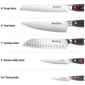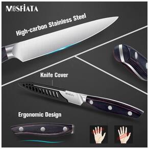 Conjunto de facas de cozinha tudo em um Conjunto de facas de cozinha de 5 peças inclui Faca de Chef, Faca de Pão, Faca Utilitária, Faca de Aparar, Faca Santoku. Conjunto de facas de aço inoxidável de alta qualidade O conjunto de facas é feito de aço inoxidável alemão de alta qualidade que resiste à ferrugem, corrosão e descoloração. as facas de cozinha afiadas são duráveis. Design ergonômico A alça sólida de Micarta minimiza a tensão do pulso, proporcionando uma aderência segura e confortável, independentemente do tamanho da mão ou de onde você segura. Mesmo após uso prolongado, a palma e o pulso não se cansarão. A durabilidade e a confiabilidade da faca de cozinha são garantidas pelo design de rebite triplo que prende o cabo firmemente à lâmina. Multi Função O conjunto de facas de cozinha é uma mistura perfeita de design para aplicações profissionais, recursos para todos os fins, cortar, fatiar, picar e picar todos os tipos de carnes, legumes, frutas e pães também. Adequado para uso doméstico e restaurante Marca: Não Informado