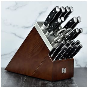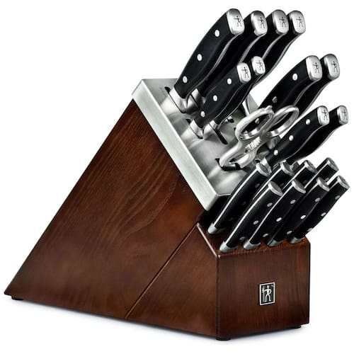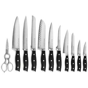 Inovador bloco de facas auto afiável feito de madeira de alta qualidade com um luxuoso acabamento em nogueira e face em aço inoxidável Cada um dos slots é rotulado e cada slot para as facas de ponta fina inclui hastes de afiação de cerâmica embutidas no ângulo apropriado, para que a faca seja afiada continuamente durante o uso normal à medida que você insere e remove as facas do bloco. Todas as lâminas, incluindo as facas de bife, são uma construção forjada com suporte completo e alças POM pretas rebitadas triplas full tang As lâminas forjadas em aço inoxidável alemão são afiadas e oferecem excelente retenção de borda Marca: Não Informado