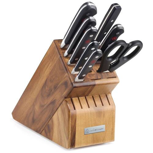 SÉRIE WSTHOF CLASSIC Conjunto de facas de 9 peças com cabos de polipropileno sintético rebitado triplo full tang que resistem ao desbotamento, descoloração, calor e impacto. A WSTHOF Classic Series tem sido nossa série mais vendida por gerações. FORJADA DE PRECISÃO As facas da série Classic da WSTHOF são forjadas a partir de um único bloco de aço inoxidável de alto carbono e temperadas a 58 graus HRC. A Tecnologia Precision Edge PEtec produz uma lâmina 20 mais afiada com o dobro da retenção da borda do que os modelos anteriores. DURÁVEL Os talheres WSTHOF são fabricados para resistir à corrosão e ao embotamento. SÉCULOS DE TRADIÇÃO Propriedade familiar há sete gerações, a WSTHOF foi fundada em Solingen, Alemanha, há mais de 200 anos Marca: Não Informado