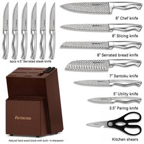 1 Faca de chef de 20,32 centímetros, faca de corte de 20,32 centímetros, faca santoku de 17,78 centímetros, faca de pão serrilhada de 20,32 centímetros, faca utilitária de 12,7 centímetros, faca de aparar de 8,89 centímetros, 6 peças de faca serrilhada de 11,43 centímetros, tesoura de cozinha doméstica multiuso, afiador de faca e bloco de faca de madeira dura preta. 2 Feito inteiramente de aço inoxidável de alto carbono, este conjunto de facas de cozinha é preso por três rebites para maior durabilidade. As alças ergonomicamente projetadas proporcionam uma pegada confortável e as alças nunca se soltam ou caem. 3 O conjunto de facas de uma peça em aço inoxidável é fácil de manter. Não só lavável à mão, mas também lavável à máquina. 4 Perfeito para quem ama a cozinha ou para s cozinheiros que estão aprendendo a cozinhar e podem satisfazer todas as necessidades culinárias É um ótimo presente de Natal para mãe, filha, esposa e namorada Marca: Não Informado