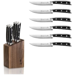 O Conjunto Inclui: 6 facas de bife com lâmina reta de 12,7 centímetros e um bloco de nogueira sólida. O cabo tem cerca de 13,97 centímetros de comprimento e a lâmina tem cerca de 12,7 centímetros de comprimento. A classificação na escala de dureza é HRC 59 , 2.