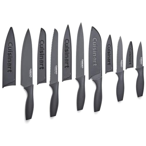 O conjunto de facas coloridas Cuisinart Advantage de 12 peças com protetores de lâmina possui arestas de corte de aço inoxidável de qualidade profissional com revestimento antiaderente de cerâmica que torna o corte ainda mais fácil e as lâminas permanecem afiadas por mais tempo.