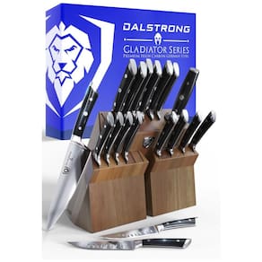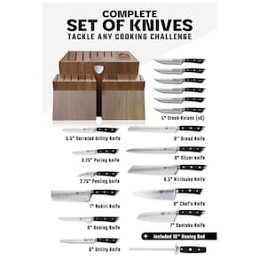Excelente artesanato, tecnologia de ponta, elementos de design impressionantes e materiais premium. O desempenho máximo nunca foi tão bom a esse preço. Aço alemão de alto carbono importado, incrivelmente nítido e com nitidez nítida, com uma borda polida à mão de 14 a 16 graus por lado. Temperado com precisão e resistente a manchas. Este conjunto durará uma vida. Design famoso, com peso satisfatório, materiais premium e sensação de qualidade. As alças pretas de luxo importadas da pakkawood têm rebites triplos com uma alça que garante conforto e manobrabilidade. Laminado e polido para uma construção sanitária, perfeito para cozinhas movimentadas Projetado com perfeição na dureza 56 Rockwell e polido à mão para um acabamento acetinado. Cuidadosamente afunilado para maior dureza, flexibilidade e resistência mínima ao corte. Todas as facas essenciais para qualquer chef, completas em um impressionante bloco de madeira de nogueira artesanal. Inclui faca do chef, kiritsuke, santoku, talhar, cortar, pão, desossar, filé, utilidade, utilidade serrilhada, aparar, bico de pássaro e 6 facas para bife e afiar aço Marca: Não Informado
