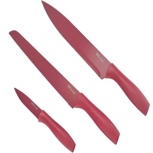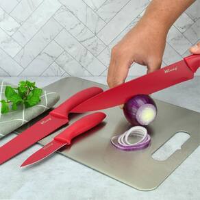 Conjunto de Facas Inox Coloridas 3 Peças COR: VERMELHO Faqueiro com as facas essenciais para a sua cozinha, confeccionadas em aço inox de alta qualidade possui cabo ergonômico que se encaixa melhor na mão dando mais firmeza na hora do manuseio, leve a alegria das cores para a sua cozinha, 4 opções azul, coral, cinza e rosa.