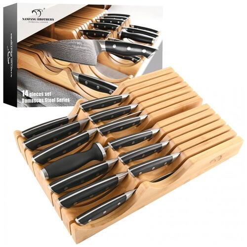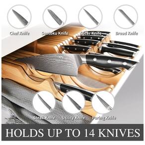 MATERIAL DURÁVEL As facas são forjadas com aço damasco superior, dureza HRC 602 para nitidez excepcional. O design de cabo ergonômico ABS curvo oferece conforto e suporte. O porta talheres com excelente artesanato é feito de bambu ecológico de alta qualidade. FIQUE NO LUGAR As ranhuras esculpidas facilitam o acesso às suas facas e outras facas com segurança nos lugares. Existem vários pés de silicone na parte inferior do porta faca para evitar tremores ou movimentos ao puxar a gaveta vigorosamente. Também garante que a ponta das facas não aponte para cima. CABE NA MAIORIA DAS GAVETAS Conjunto de blocos de facas de cozinha com design perfeito e praticidade. Mantenha as facas organizadas em sua gaveta para economizar espaço no balcão da cozinha Marca: Não Informado