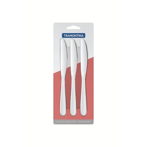 Conjunto De Facas Para Sobremesa Angra Tramontina Em Aço Inox 3 Peças Tramontina Conjunto de Facas para Sobremesa Angra Tramontina em Aço Inox 3 Peças Tramontina - - Totalmente feitas de aço inox, altamente duráveis, mantêm suas características , preservando a beleza, a higiene e a durabilidade do material. - Facas totalmente temperadas, que garante maior durabilidade no fio de corte e maior resistência à corrosão, e por sua característica de temperabilidade, não riscam as porcelanas. - Acabamento em brilho, com detalhes no cabo. - Próprias para diário combinam com qualquer ambiente. - Podem ser lavadas diariamente na máquina de lavar louças. Características Gerais do Produto: Garantia: - 90 dias de garantia legal para vícios ou defeitos de fabricação