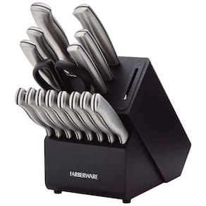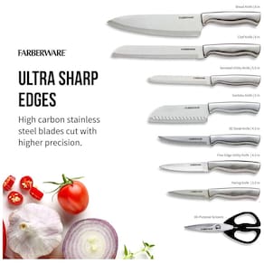 TECNOLOGIA EDGEKEEPER Este conjunto inclui um bloco de madeira com acabamento natural com um EdgeKeeper universal embutido no afiador de facas, para afiar facas de ponta fina de maneira fácil e conveniente. As lâminas afiam ao remover e inserir as facas no slot designado LÂMINA DE ALTA QUALIDADE Cada lâmina é habilmente fabricada em aço inoxidável de alto carbono de qualidade superior que garante que as lâminas retenham sua borda ultra afiada por mais tempo do que o aço inoxidável convencional e fornecem resultados de precisão COMFORT GRIP Com acabamento acetinado, as alças são feitas de aço inoxidável e ergonomicamente projetadas para uma pegada confortável cada faca é perfeitamente balanceada para precisão durante o corte CONJUNTO DE BLOCO DE FACA DE 16 PEÇAS Este conjunto inclui uma faca de chef de 8 polegadas, faca de pão de 8 polegadas, faca serrilhada de 5,5 polegadas, faca Santoku de 5 polegadas, faca de corte fino de 4,5 polegadas, faca de 3,5 polegadas, 8 facas de bife de 4,5 polegadas , tesouras multifuncionais e um bloco de zenamento com afiador de facas integrado. CUIDADO FÁCIL Lavar à mão com água morna e detergente neutro enxágue e seque imediatamente garantia vitalícia limitada Marca: Não Informado