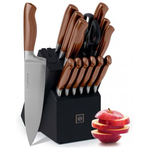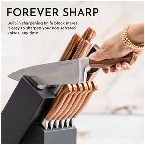 ELEVE SUA COZINHA COM ESTE CONJUNTO DE FACAS DE COZINHA LUXE DE COBRE E PRETO COM BLOCO complemente a decoração preta e cobre e os utensílios de cozinha de cobre com este deslumbrante conjunto de facas de cozinha em ouro rosa moderno de 14 peças com apontador inclui faca de cozinha grande do chef, faca de trinchar, faca de pão, faca utilitária, faca de aparar, faca santoku, 6 facas de bife em ouro rosa e tesoura de cozinha resistente em aço inoxidável, tudo alojado em um bloco de facas de madeira preta com apontador. POSSUA AS FACAS MAIS AFIADAS DO BLOCO COM ESTE CONJUNTO DE FACAS DE AFIAÇÃO AUTOMÁTICA nossos conjuntos de facas de cozinha com auto afiação de bloco são feitos de aço inoxidável de alta qualidade que oferece grande resistência, resistência à corrosão e retenção de borda para excelente desempenho e exclusivo afiador embutido garante suas facas não ficarão cegas e ficarão afiadas para sempre recomendamos lavar à mão e secar imediatamente para manter o desempenho, aparência e brilho do seu conjunto de facas de chef. O CONJUNTO DE FACAS DE OURO E PRETO DE QUALIDADE PREMIUM FACILITA COZINHAR MAIS FÁCIL equipe sua casa com este conjunto de facas moderno e coeso que se afia automaticamente com porta facas para bancada de cozinha cada faca dourada é projetada ergonomicamente com uma alça confortável e trabalhada com uma lâmina full tang com rebites triplos para durabilidade e equilíbrio prepare carne, peixe, legumes, frutas, pão e muito mais com facilidade com uma variedade de facas autoafiáveis para qualquer finalidade em nosso conjunto de facas para cozinha. SIMPLIFIQUE SUA CASA COM ESTE CONJUNTO DE FACAS DE COZINHA PRETO E COBRE elimine conjuntos incompatíveis ou facas soltas e sem brilho que bagunçam as gavetas e melhore sua estética de cozinha com nosso conjunto de facas de cobre com bloco de afiação automática projetado propositalmente para complementar a decoração de cozinha em preto e cobre ou preto e cobre acessórios de cozinha e sejam exibidos com orgulho em sua bancada Conjuntos de facas para cozinha com tesouras são um presente atencioso para férias, casamento, inauguração de casa ou formatura Marca: Não Informado