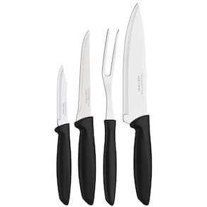 Características do produto:<br/>Cor:Cabo Preto<br/>Modelo: Plenus<br/>Marca: Tramontina<br/>Fabricante: Tramontina<br/>Sessão: Facas<br/>Quantidade de Peças: 4 peças<br/>As lâminas de aço inox tem maior durabilidade do fio devido ao tratamento térmico. <br/>Os cabos de polipropileno possuem maior resistência e durabilidade. <br/>Podem ir à máquina de lavar louças facilitando seu dia a dia.<br/><br/>Dicas para Utilização:<br/>Antes da primeira utilização, lave bem as peças e seque-as. <br/>Tenha cuidado ao manusear produtos cortantes e perfurantes e mantenha-os fora do alcance de crianças. <br/>Para maior durabilidade dos produtos, recomenda-se secar bem antes de guardar, mesmo após lavagem em máquina.<br/>Para descarte dos produtos e embalagens siga as orientações de reciclagem vigentes.<br/><br/>Conteúdo do Jogo:<br/>1 Faca Chef 7" Plenus<br/>1 Faca para Desossar 5" Plenus<br/>1 Faca para Legumes e Frutas 3" Plenus<br/>1 Garfo Trinchante Plenus<br/><br/>Dimensões:<br/>Dimensões Embalagem (Compr. X Larg. X Alt.): 2,x 16,3 x ,84 cm<br/><br/>Peso:<br/>Peso Líquido: 0,2100 kg.<br/>Peso Bruto: 0,2500 kg.<br/><br/>Garantia: 3 Meses ( ofertada pelo fabricante)<br/><br/><br/>Fornecedor: Tramontina<br/>;