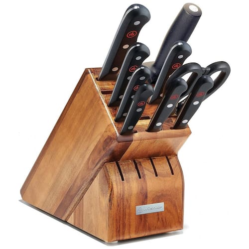 SÉRIE WSTHOF GOURMET Conjunto de facas de 10 peças com cabos de polipropileno sintético com rebites triplos que resistem ao desbotamento, descoloração, calor e impacto. Facas estampadas precisamente cortadas a laser oferecem excelente qualidade e valor. RAZOR SHARP Lâminas de Aço Inoxidável de Alto Carbono, cortadas com precisão com a mais recente tecnologia de ponta para uma nitidez incrível e fácil manutenção. As facas de cozinha WSTHOF só podem ser lavadas à mão. DURÁVEL Os talheres WSTHOF são fabricados para resistir à corrosão e ao embotamento. Este conjunto de facas de cozinha feito na Alemanha vem com uma garantia vitalícia limitada. SÉCULOS DE TRADIÇÃO Propriedade familiar há sete gerações, a WSTHOF foi fundada em Solingen, Alemanha, há mais de 200 anos. Os talheres da WSTHOF levam o nome Solingen, designação reservada para produtos que atendem aos mais rígidos padrões de qualidade Marca: Não Informado