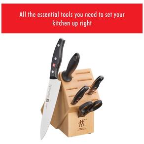 As facas Twin Signature da ZWILLING são produzidas com precisão a partir de uma única peça de aço alemão, resultando em facas mais leves que não comprometem a afiação. Feitas de aço especial patenteado, aperfeiçoado ao longo de 280 anos, essas lâminas FRIODUR, combinadas com a técnica de endurecimento por gelo da ZWILLING, são mais duras, mais afiadas, não mancham, não lascam e mantêm a afiação por mais tempo. As alças com três rebites embutidos com o logo da ZWILLING J.A. Henckels oferecem durabilidade máxima. As facas ZWILLING ultra afiadas começam cortantes e permanecem afiadas por mais tempo. Com 57 Rockwell Hardness, excelente retenção de borda e ângulo de 15 graus por lado, este conjunto é ideal para qualquer cozinha. Construídas para durar, as facas ZWILLING são o resultado de quase 300 anos de experiência em fabricação de facas. Ergonomicamente projetadas para conforto máximo, estas facas equilibram força e precisão. O conjunto inclui: Faca de Desossa de 4 polegadas, Faca Utilitária Serrilhada de 5 polegadas, Faca do Chef de 8 polegadas, Tesoura de Cozinha, Aço de Afiar de 9 polegadas e Bloco de Madeira com 10 Slots.