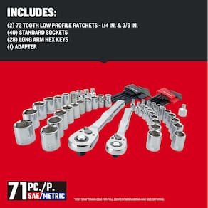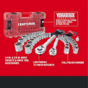 CRAFTSMAN Conjunto de ferramentas mecânicas Versastack, unidade de 1/4 e 3/8 polegadas, 71 peças (CMMT45171) - Catraca de perfil baixo: cabeça até 25% mais fina* para acesso em espaços apertados (em comparação com CMMT81747 e CMMT81748) - Catraca de 72 dentes: oferece balanço de arco de 5 graus - Conveniência: conjunto abrangente de soquetes de acionamento de 0,6 cm e 3/8" e acessórios de ferramentas de acionamento - RESISTÊNCIA À CORROSÃO: Acabamento cromado polido completo - Compatível com Versastack: Este sistema de armazenamento flexível permite uma combinação personalizada com base nas necessidades do usuário - GARANTIA VITALÍCIA COMPLETA