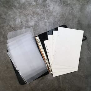 Fichário de feltro de 6 furos com páginas (80 folhas) e conjunto de bolso para fichário - Capa de feltro, quente e leve, com suporte para caneta e compartimentos para cartão dentro, e gráfico de grade, pontos, em branco, refil de linha, 20 folhas para cada, 1 régua, 1 divisor, 1 divisor, 1 bolso de papel, 1 bolso com zíper, 1 porta-cartão de nome - Tamanho: A5 - Os anéis redondos podem ser abertos e fechados facilmente quando você precisar adicionar ou remover páginas e segurar as páginas com segurança - Adequado para páginas internas de agenda de 6 furos - Ideal para fazer seu próprio caderno de viagem, álbum de fotos e organizadores pessoais