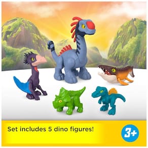 Conjunto de figuras Fisher-Price Imaginext Jurassic World Rebirth desenvolvido para crianças a partir de 3 anos, com foco em brincadeiras de ação e narrativa inspiradas nos filmes da franquia. O kit inclui 1 figura humana de aproximadamente 7,6 cm e 5 dinossauros em diferentes tamanhos, sendo um com cerca de 12,7 cm de altura e dois com partes em material de textura diferenciada.?