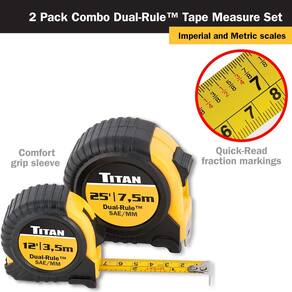 Conjunto de 2 peças de fita métrica Titan 10903 - Inclui (2) fita métrica, comprimentos: 3,6 m e 6,5 m - As lâminas mostram medidas padrão e métricas - Capa de plástico resistente a impactos - Almofadas ergonômicas para o máximo de conforto - Trava de lâmina mãos livres