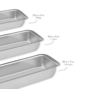 Esse conjunto de formas conta com 03 peças de diferentes tamanhos, todas desenvolvidas em alumínio resistente, não permitindo que absorva cheiro, cor ou sabor dos alimentos, são ideais a qualquer forno. Além de possuir antiaderente interno e externo, auxiliando no cozimento e limpeza do item. O material é resistente e super prático de usar, a escolha perfeita para facilitar seu dia a dia na cozinha, podendo até mesmo armazenar ou servir as diversas receitas que fizer. ESPECIFICAÇÕES: Material: Alumínio Cor: Cinza Dimensões: -01 FORMA GRANDE: Comprimento 30,5cm x Largura: 13,5cm x Profundidade 5,6cm -01 FORMA MÉDIA: Comprimento 27,5 cm x Largura: 12,5 x Profundidade: 5cm -01 FORMA PEQUENA: Comprimento : 24m x Largura: 11cm x Profundidade 4,5cm Capacidade: -FORMA GRANDE: 1,4 litro -FORMA MÉDIA: 1 litro -FORMA PEQUENA: 770 ml Peso: -FORMA GRANDE: Aprox. . 150g -FORMA MÉDIA: Aprox. 115g -FORMA PEQUENA: Aprox. 100g CONTÉM: 01 CONJUNTO DE FORMAS DE PÃES 3 PEÇAS