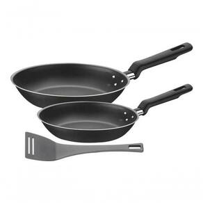Conjunto De Frigideiras Tramontina Loreto 3 Peças As duas frigideiras são produzidas em alumínio, que proporciona um cozimento rápido e uniforme dos alimentos, devido sua espessura. Seu revestimento interno e externo antiaderente Starflon T1 possui alto poder de antiaderência e ainda garante maior resistência à abrasão, prolongando sua vida útil em 5.000 ciclos. Para dar mais segurança no manuseio, os cabos são produzidos em baquelite antitérmico, que não esquenta e evita queimaduras. Além disso, acompanha uma espátula para lhe auxiliar nas mais diversas receitas. É um jogo essencial em sua cozinha, pois é resistente, durável e prático, podendo ir à máquina de lavar louças todos os dias. Garanta já o seu e tenha momentos inesquecíveis na cozinha! Recomendações de Uso: - Ao utilizar utensilios quentes tenha cuidado redobrado.- Se necessário, utilize proteção para as mãos e mantenha fora do alcance de crianças.- Para sua segurança, ao utilizar utensílios com cabos, mantenha os mesmos sempre voltados para o centro do fogão.- Ao utilizar seu utensílio em fogões com grade, mantenha a peça centralizada e alinhe o cabo com a grade, para reduzir o risco de queda.- Para descarte dos produtos e embalagens siga as orientações de reciclagem vigentes. Informações Adicionais:
