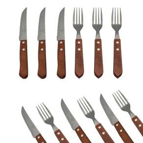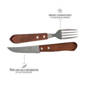 Conjunto De Garfo E Faca Inox 12 Peças - Wooden Conjunto de Garfo e Faca Inox 12 Peças - Wooden Proporcionando sofisticação, esse conjunto de garfo e facas é perfeito para quem busca beleza, durabilidade e funcionalidade em sua em aço inoxidável de alta qualidade, esse conjunto proporciona resistência e brilho duradouro. As peças são projetadas para oferecer um encaixe perfeito na mão, garantindo conforto e precisão durante o uso.Contando com 12 peças, sendo elas 6 garfos e 6 facas, você terá utensílios suficientes para acomodar a familia e convidados em ocasiões especiais, seja para um jantar ou um almoço casual, adicionando um toque de elegância em sua ém de sua beleza e estética, o aço inoxidável possui uma excelente resistência e um brilho duradouro, garantindo também facilidade na hora da limpeza. Projetados para resistir a manchas e não enferrujar, conservando seu brilho por muito tempo. ESPECIFICAÇÕES:Material: Inox e MadeiraDimensões: -Garfo: Comprimento: 19cm x Larg.: 2,5cm-Faca: Comprimento: 21cm x Larg.: 1,7cmPeso:-Garfo: Aprox. 25g-Faca: Aprox. 25g CONTÉM:01 CONJUNTO DE GARFO E FACA INOX 12 PEÇAS - WOODEN