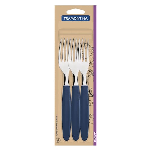 Produto: Conjunto de Garfos de MesaModelo: 23362310Marca: TramontinaLinha: IpanemaMaterial (Cabos): Polipropileno (Polypropylene)Cor do Cabo: AzulCaracterísticas: Garfos com alta resistência à corrosão e durabilidade.Cabos de polipropileno com design moderno que proporciona conforto e segurança no manuseio.Não riscam os pratos.Design moderno e funcional. Limpeza: Pode ser levado à máquina de lavar louças.Peso (Produto): 0,38 kg (380 grams) - Consistent.Confidence Score: 5/5. All key technical specifications are consistently confirmed across multiple reliable sources, including the official Tramontina website and reputable retailers.