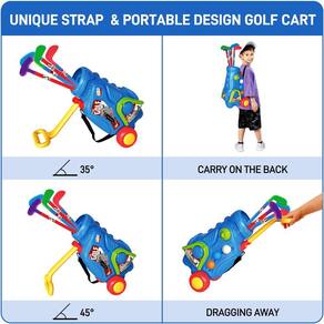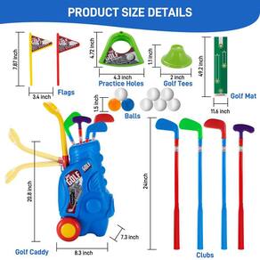- Kit básico completo de golfe para crianças: o conjunto de golfe inclui carrinho de tacos de golfe, tapete de golfe, 4 tacos de golfe, 2 buracos de treino, 8 bolas, camisetas de golfe e bandeiras. Projetado para crianças de 2 a 5 anos para praticar golfe.