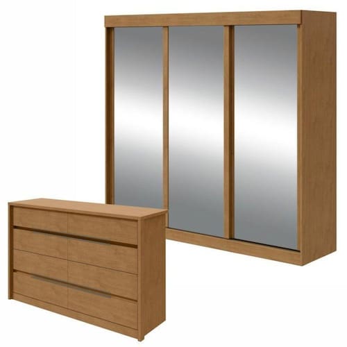 O conjunto inclui um guarda-roupa Saion Plus com 3 portas e 3 gavetas, acompanhado por uma cômoda Urban de 8 gavetas. Esses móveis oferecem uma solução completa para armazenar roupas e itens pessoais, combinando funcionalidade e estilo contemporâneo.