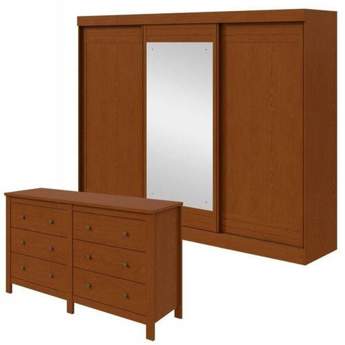 O conjunto inclui um guarda-roupa Nice de 3 portas e 4 gavetas, juntamente com uma cômoda Maggiore New de 6 gavetas, fabricados em MDP/MDF. Esses móveis oferecem uma solução completa para armazenar roupas e itens pessoais, combinando funcionalidade com um design contemporâneo e durável.