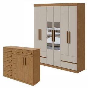 O conjunto inclui um guarda-roupa Zeus com 4 portas, 2 gavetas e espelho, além de uma cômoda Toronto com 8 gavetas e 2 portas. Esses móveis oferecem solução completa para organização, combinando funcionalidade e design contemporâneo.