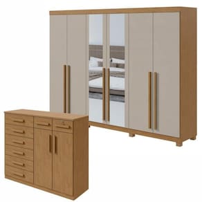 1x Guarda-roupa 6 Portas 4 Gavetas Bertha com Espelho e com Pés Amêndoa Clean/Off White Largura: 270 cm Altura: 237 cm Peso: 211,17 kg Profundidade: 51,8 cm Necessita Montagem: Sim
