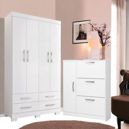 O guarda roupa é feito em MDP 4 gavetas com corrediças telescópicas, 4 Portas, 2 prateleiras e 1 cabideiro.