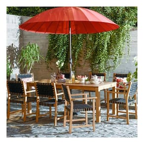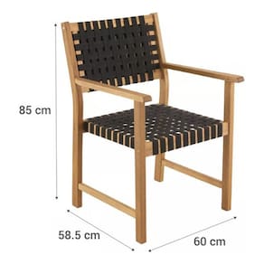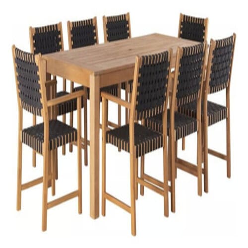 Material: Madeira de eucalipto com detalhes em cordas. Cor: Madeira/Preto Tipo: Jogos de jantar para áreas externas. Peças Incluídas: 8 cadeiras com apoios de braço e 1 mesa. Peso do Produto: 89,8 kg. Uso: Doméstico. Modelo: Parga. Garantia: 12 meses. Estilo de Decoração: Boho Chic. Capacidade: Para 8 pessoas. Dimensões:
