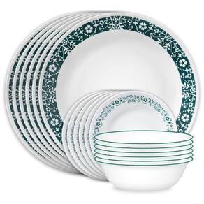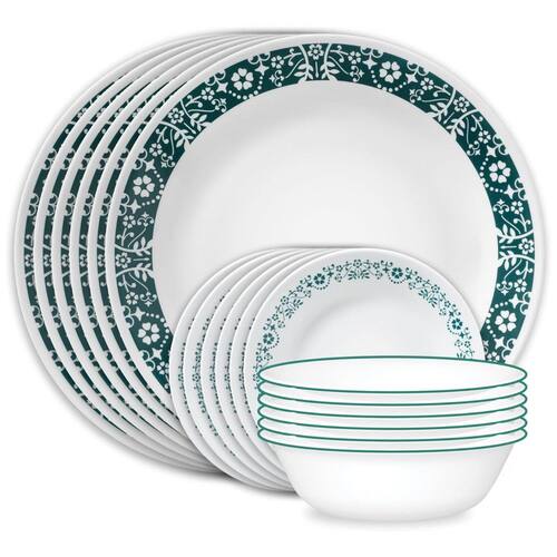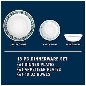 Traga estilo atemporal para a sua mesa com este versátil conjunto de jantar Corelle. Com 18 peças, incluindo seis pratos rasos de 26cm, seis pratos de pão de 16cm e seis tigelas de sopa/cereal de 532ml. Este conjunto em elegante verde esmeralda possui um toque vintage. Feito em vidro resistente de tripla camada Corelle, é leve, empilhável e resistente a quebras e chips. Pode ir à lava-louças, micro-ondas e forno. Leve e resistente, este conjunto evita lascas e rachaduras, é fácil de empilhar e ocupa metade do espaço de pratos cerâmicos. Baixa manutenção, higiênico e fácil de limpar. Adicione estilo e elegância à sua mesa com este conjunto clássico Corelle. Não utilizar em fogão, grelha ou micro-ondas com elemento de aquecimento.