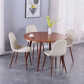 A mesa redonda de 110 cm de diametro e 75 cm de altura, na cor cafe, combina perfeitamente com as 4 cadeiras em branco e cafe, criando um contraste harmonioso e moderno. Fabricado com estrutura em madeira de alta qualidade, o conjunto garante resistencia e durabilidade para seu dia a dia.
