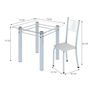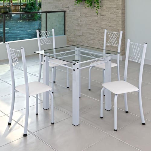 Quer deixar sua casa completa? Uma dica bacana de como transformar o seu lar, deixando-o mais receptivo e bonito? Então você precisa de móveis indispensáveis e deixar seu lar muito mais aconchegante, receptivo e sempre disponível para receber a visita de amigos, familiares e convidados. Você vai se apaixonar por este incrível Conjunto de Mesa com 4 Cadeiras Dany. Ideal para cozinha, ele é a melhor opção para completar o espaço. Aproveite!! Medida da Mesa (A x L x P): 75 cm x 75 cm x 75 cm Peso da Mesa: 12,6 kg Mesa suporta até: 8.0000 Acabamento da Cadeira/Banco: Pintura Texturizada Acabamento da Mesa: Pintura Texturizada Ambiente Principal: Cozinha Cadeira/Banco estofada: Somente Assento Estofado Cadeira/Banco suporta até: 120.0000 codigo_ean: 7909903360804 Complexidade da Montagem: Média: pode ser montado por mais de uma pessoa e/ou necessite de maior conhecimento para montagem Cor: Branco Liso/Branco Cor do Produto: Branco Liso/Branco Escala de Brilho: Semi-Brilho Espessura do Tampo: 6 mm Itens Inclusos: 1 Mesa, 4 Cadeiras, Kit Ferragens e Manual de Montagem Linha ou Coleção: Sara Manual de Especificação Técnica: https://product-hub-prd.madeiramadeira.com.br/860729/documents/c202054e-5150-4231-bb89-e85ff86cd0d6parasaladejantarv02yescasa.pdf Manual de Montagem e Instalação: https://product-hub-prd.madeiramadeira.com.br/860729/documents/543a367d-a497-4cea-afd2-099a977d5d5cidrosaladejantarv02yescasa.pdf Manutenção: Pano levemente umedecido e pano seco. Não utilizar produtos de limpeza abrasivos. Material da Base da Mesa: Aço Material da Estrutura da Cadeira: Aço Material do Tampo: Vidro Medida da Base (A x L x P): 74,3 cm x 73 cm x 54 cm Medida da Cadeira/Banco (A x L x P): 95 cm x 40 cm x 37 cm Medida do Tampo (L x C x E): 75 cm x 75 cm x 0,6 cm Necessita Montagem: Sim Origem do Produto: Nacional Peso da Cadeira/Banco: 2,94 kg Possui Apoio Para os Pés: Não Quantidade de Cadeiras: 4 Quantidade de Lugares: 04 Recomendações de Uso, Manutenção e Limpeza: Pano levemente umedecido e pano seco. Não utilizar produtos de limpeza abrasivos. Sistema de Montagem: Parafusos Vidro Temperado: Sim