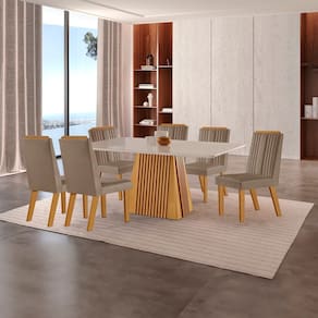 Dê um toque de charme à sua sala de jantar com a Mesa Áustria, acompanhado por quatro cadeiras Florença. A mesa, com seu design refinado e acabamento impecável, torna-se o centro das atenções, oferecendo um espaço generoso para refeições memoráveis. As cadeiras, elegantes e confortáveis, completam o conjunto, proporcionando o ambiente ideal para desfrutar de momentos especiais com sua família e amigos. Transforme sua sala de jantar em um espaço acolhedor e elegante . Medida da Mesa (A x L x P): 80cmx80cmx160cm Peso da Mesa: 51,4 kg Mesa suporta até: 30.0000 Acabamento da Cadeira/Banco: Pintura UV Acabamento da Mesa: Pintura UV Ambiente Principal: Sala de Estar Cadeira/Banco Estofada: Encosto e Assento Estofados Cadeira/Banco estofada: Encosto e Assento Estofados Cadeira/Banco suporta até: 120.0000 codigo_ean: 7909903966457 Complexidade da Montagem: Média: pode ser montado por mais de uma pessoa e/ou necessite de maior conhecimento para montagem Cor: Castanho Cinamomo / Capuccino / Off White Cor do Produto: Castanho Cinamomo / Capuccino / Off White De Canto (Canto Alemão): Não Enchimento do Assento: Espuma D-20 Enchimento do Encosto: Espuma D-18 Escala de Brilho: Semi-Fosco Espessura do Tampo: 25 mm Formato do Tampo: Retangular Itens Inclusos: 1 Mesa, 6 Cadeiras, Kit Ferragens e Manual de Montagem Manual de Especificação Técnica: https://product-hub-prd.madeiramadeira.com.br/956246/documents/a6aefe52-2151-46bf-a4c6-fe097847e4a722379228286817272702711207.pdf Manual de Montagem e Instalação: https://product-hub-prd.madeiramadeira.com.br/956246/documents/6ae5b0d5-3941-437b-95eb-f6a0379d57d4e2379227286817272702672889.pdf Material da Base da Mesa: MDF/MDP Material da Estrutura da Cadeira: MDF/MDP Material do Tampo: Vidro/MDF Medida da Cadeira/Banco (A x L x P): 99cmx43cmx54,5cm Medida do Tampo (L x C x E): 80cmx1,60cmx2,5cm Mesa Extensível: Não Necessita Montagem: Sim Origem do Produto: Nacional Peso da Cadeira/Banco: 8,85 kg Possui Apoio para Braços: Não Possui Apoio Para os Pés: Não Quantidade de Cadeiras: 6 Quantidade de Lugares: 04 Recomendações de Uso, Manutenção e Limpeza: Para melhor conservação do seu móvel, não utilizar produtos de limpeza. Utilizar somente levemente úmido. Revestimento da Cadeira/Banco: Suede Sistema de Montagem: 1 Mesa, 6 Cadeiras, Kit Ferragens e Manual de Montagem