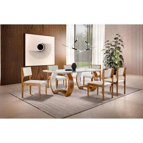 Mesa de lâmina de madeira cinamomo, com tampo laqueado e vidro serigrafado grafite, temperado. Cadeira de madeira maciça tauari, com assento em espuma D23 revestido em tecido veludo e encosto em tela marroml. Medida da Mesa (A x L x P): 180 x 90 x 80cm Peso da Mesa: 121 Mesa suporta até: 80 Acabamento da Cadeira/Banco: Pintura Acabamento da Mesa: Verniz Marroml Almofada do assento: Fixa Altura do Conjunto: 90 Ambiente Principal: Sala de Jantar Apoio para Braços Estofado: Não Cadeira/Banco estofada: Somente Assento Estofado Cadeira/Banco suporta até: 120 Complexidade da Montagem: Média: pode ser montado por mais de uma pessoa e/ou necessite de maior conhecimento para montagem Cor: Cinamomo/Imbuia/Off White Cor da Base: Marrom Cor do Produto: Cinamomo/Imbuia/Off White Cor do Tampo: Branco Cor Flex: Não Cor Secundária: Branco De Canto (Canto Alemão): Não Design da Base: Cilindro Enchimento do Assento: Espuma D-23 Escala de Brilho: Fosco Espessura do Tampo: 40 Espessura do Vidro: mm Estrutura do Assento: Madeira maciça tauari, 3cm Estrutura do Encosto: 3cm Formato do Tampo: Retangular Informações Complementares: Conjunto com um designer super moderno com muita qualidade e conforto Itens Inclusos: 1 Mesa, 6 Cadeiras, Manual de Montagem e Kit Ferragens Linha ou Coleção: Bari Manual de Montagem e Instalação: https://cdn2.madeiramadeira.com.br/atributo/mobilare/1360366-27779-16-370-11-manual-de-montagem.pdf Material da Base da Mesa: Madeira Maciça Material da Estrutura da Cadeira: Madeira Maciça Material do Tampo: Madeira Maciça Medida da Base (A x L x P): 78 x 86.5 x 25cm (2 peças) Medida da Cadeira/Banco (A x L x P): 90 x 47 x 52cm Medida do Canto Alemão (A x L x P): Não possui Medida do Suporte Giratório (L x C x E): Não possui Medida do Tampo (L x C x E): 180 x 90 x 4cm Mesa Extensível: Não Montagem Flex: Não Necessita Montagem: Sim Origem do Produto: Nacional Peso da Cadeira/Banco: 8.5 Possui Apoio para Braços: Não Possui Apoio Para os Pés: Não Possui Suporte Giratório: Não Quantidade de Lugares: 06 Recomendações de Uso, Manutenção e Limpeza: Limpar com pano seco Revestimento da Cadeira/Banco: Veludo Sistema de Montagem: Parafusos Tipo de Madeira Maciça da Base da Mesa: Tauari Tipo de Madeira Maciça do Tampo: Tauari Vidro Temperado: Sim Ean: 7909903331569