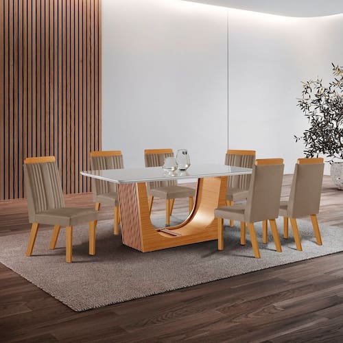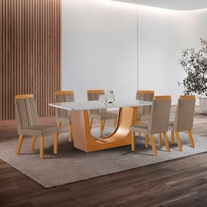 Essa mesa de jantar traz um visual sofisticado e moderno, ideal para compor ambientes elegantes e acolhedores. O tampo retangular em vidro off/White garante leveza visual e fácil limpeza, enquanto a base se destaca pelo seu design escultural em formato de “U”, com ripado vertical que imprime movimento e personalidade à peça. As cadeiras anatômicas trazem todo conforto para receber seus amigos em um jantar ou até mesmo no dia a dia com a família. Medida da Mesa (A x L x P): 80cmx180cmx90cm Peso da Mesa: 53,3 kg Mesa suporta até: 50 kg Acabamento da Cadeira/Banco: Pintura UV Acabamento da Mesa: Pintura UV Almofada do assento: Fixa Ambiente Principal: Sala de Jantar Cadeira/Banco estofada: Encosto e Assento Estofados Cadeira/Banco Estofada: Encosto e Assento Estofados Cadeira/Banco suporta até: 120 kg codigo_ean: 7900288198051 Complexidade da Montagem: Média: pode ser montado por mais de uma pessoa e/ou necessite de maior conhecimento para montagem Cor: Castanho Cinamomo/Capuccino/Off White Cor do Produto: Castanho Cinamomo/Capuccino/Off White Cor Secundária: Bege De Canto (Canto Alemão): Não Design da Base: Em U Enchimento do Assento: Espuma D-20 Escala de Brilho: Semi-Fosco Espessura do Tampo: 40 mm Estrutura do Assento: MDF/MDP/Espuma Formato do Tampo: Retangular Itens Inclusos: 1 Mesa, 6 Cadeiras, Kit Ferragens e Manual de Montagem Linha ou Coleção: Florença Manual de Especificação Técnica: https://product-hub-prd.madeiramadeira.com.br/254433224/documents/46888976-b9aa-4a07-8f90-9daf46b9d3ef3085146286817531057586549.pdf Manual de Montagem e Instalação: https://product-hub-prd.madeiramadeira.com.br/254433224/documents/fa7ac071-ef0e-4139-993f-6f73b54646f23085145286817531057500801.pdf Marca: Yescasa Material da Base da Mesa: MDF/MDP Material da Estrutura da Cadeira: MDF/MDP Material do Tampo: Vidro/MDF Material Principal: MDP/MDF Material Principal das Cadeiras/Bancos: MDF/MDP Medida da Cadeira/Banco (A x L x P): 101cm x 43,5cm x 54cm Medida do Tampo (L x C x E): 90cmx180cmx2,5cm Mesa Dobrável: Não Mesa Extensível: Não Necessita Montagem: Sim Origem do Produto: Nacional Peso da Cadeira/Banco: 8,8 kg Possui Apoio para Braços: Não Possui Apoio Para os Pés: Não Possui Vidro: Sim Quantidade de Cadeiras: 6 Quantidade de Lugares: 06 Recomendações de Uso, Manutenção e Limpeza: Pano úmido. Não utilizar produtos de limpeza Revestimento da Cadeira/Banco: Suede Sistema de Montagem: Cavilhas, Parafusos e Cantoneiras. Tipo de Assento: Fixo Tipo de Encosto: Fixo