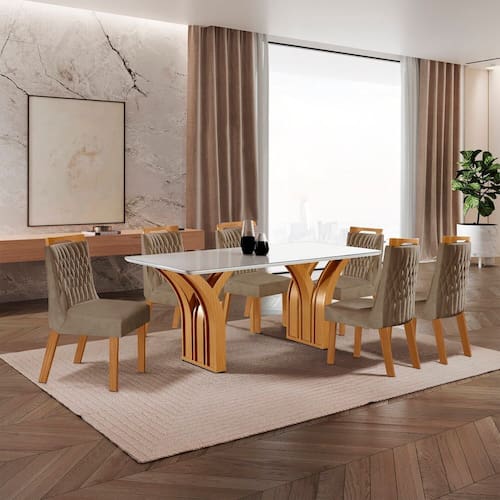 Com um design sofisticado e marcante, a mesa de jantar Miami traz um toque de elegância contemporânea ao ambiente. Seu tampo retangular em vidro off White, proporciona leveza e modernidade, enquanto os dois robustos pés centrais chamam a atenção com seu formato escultural, composto por curvas orgânicas e sobreposições que lembram uma arquitetura artística. As cadeiras anatômicas trazem todo conforto para receber seus amigos em um jantar ou até mesmo no dia a dia com a família. Além do bordado ser lindo, né?! Medida da Mesa (A x L x P): 80cmx180cmx90cm Peso da Mesa: 53,3 kg Mesa suporta até: 50 kg Acabamento da Cadeira/Banco: Pintura UV Acabamento da Mesa: Pintura UV Almofada do assento: Fixa Ambiente Principal: Sala de Jantar Cadeira/Banco estofada: Encosto e Assento Estofados Cadeira/Banco Estofada: Encosto e Assento Estofados Cadeira/Banco suporta até: 120 kg codigo_ean: 7900288197252 Complexidade da Montagem: Média: pode ser montado por mais de uma pessoa e/ou necessite de maior conhecimento para montagem Cor: Castanho Cinamomo / Pena Caramelo / Off White Cor do Produto: Castanho Cinamomo / Pena Caramelo / Off White Cor Secundária: Bege De Canto (Canto Alemão): Não Design da Base: Pedestal Duplo Enchimento do Assento: Espuma D-20 Escala de Brilho: Semi-Fosco Espessura do Tampo: 40 mm Estrutura do Assento: MDF/MDP/Espuma Formato do Tampo: Retangular Itens Inclusos: 1 Mesa, 6 Cadeiras, Kit Ferragens e Manual de Montagem Linha ou Coleção: Miami Manual de Especificação Técnica: https://product-hub-prd.madeiramadeira.com.br/540496142/documents/58508ca4-8bfd-4d7c-a1cf-24feb86bda683084982286817531047059588.pdf Manual de Montagem e Instalação: https://product-hub-prd.madeiramadeira.com.br/540496142/documents/d5351bb1-cfda-4702-bf45-3c6da8ba6d273084981286817531046966127.pdf Marca: Yescasa Material da Base da Mesa: MDF/MDP Material da Estrutura da Cadeira: MDF/MDP Material do Tampo: Vidro/MDF Material Principal: MDP/MDF Material Principal das Cadeiras/Bancos: MDF/MDP Medida da Cadeira/Banco (A x L x P): 96cm x 47cm x 59cm Medida do Tampo (L x C x E): 90cmx180cmx2,5cm Mesa Dobrável: Não Mesa Extensível: Não Necessita Montagem: Sim Origem do Produto: Nacional Peso da Cadeira/Banco: 9,85 kg Possui Apoio para Braços: Não Possui Apoio Para os Pés: Não Possui Vidro: Sim Quantidade de Cadeiras: 6 Quantidade de Lugares: 06 Recomendações de Uso, Manutenção e Limpeza: Pano úmido. Não utilizar produtos de limpeza Revestimento da Cadeira/Banco: Suede Sistema de Montagem: Cavilhas, Parafusos e Cantoneiras. Tipo de Assento: Fixo Tipo de Encosto: Fixo